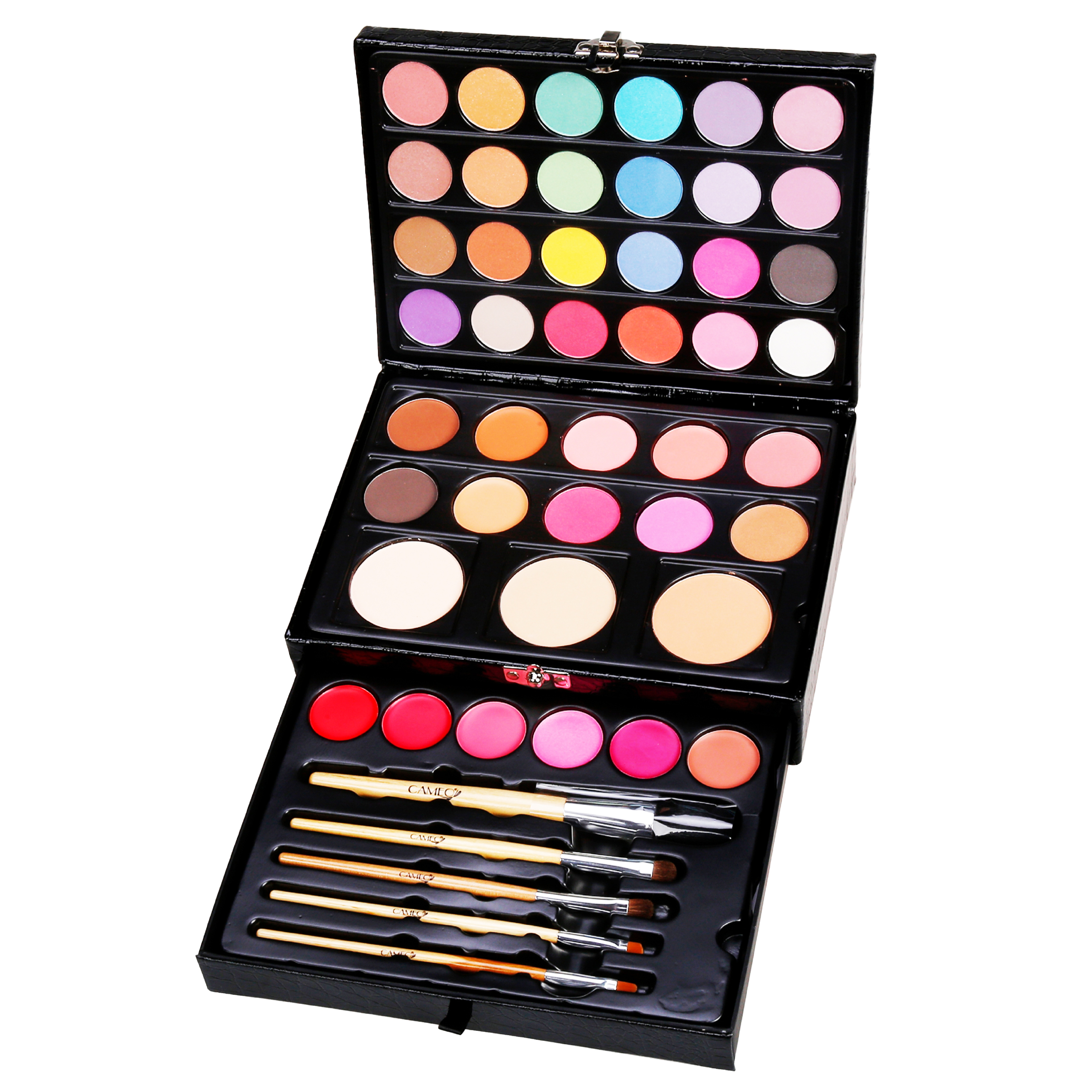 Este elegante estuche rosa con acabado brillante incluye una amplia variedad de tonos y productos para rostro, ojos y labios. Contiene sombras, rubores, labiales y brochas en un formato plegable y organizado. Su diseño compacto con cierre metálico lo hace ideal para viajar o regalar. Perfecto para quienes buscan un kit versátil, funcional y con estilo.