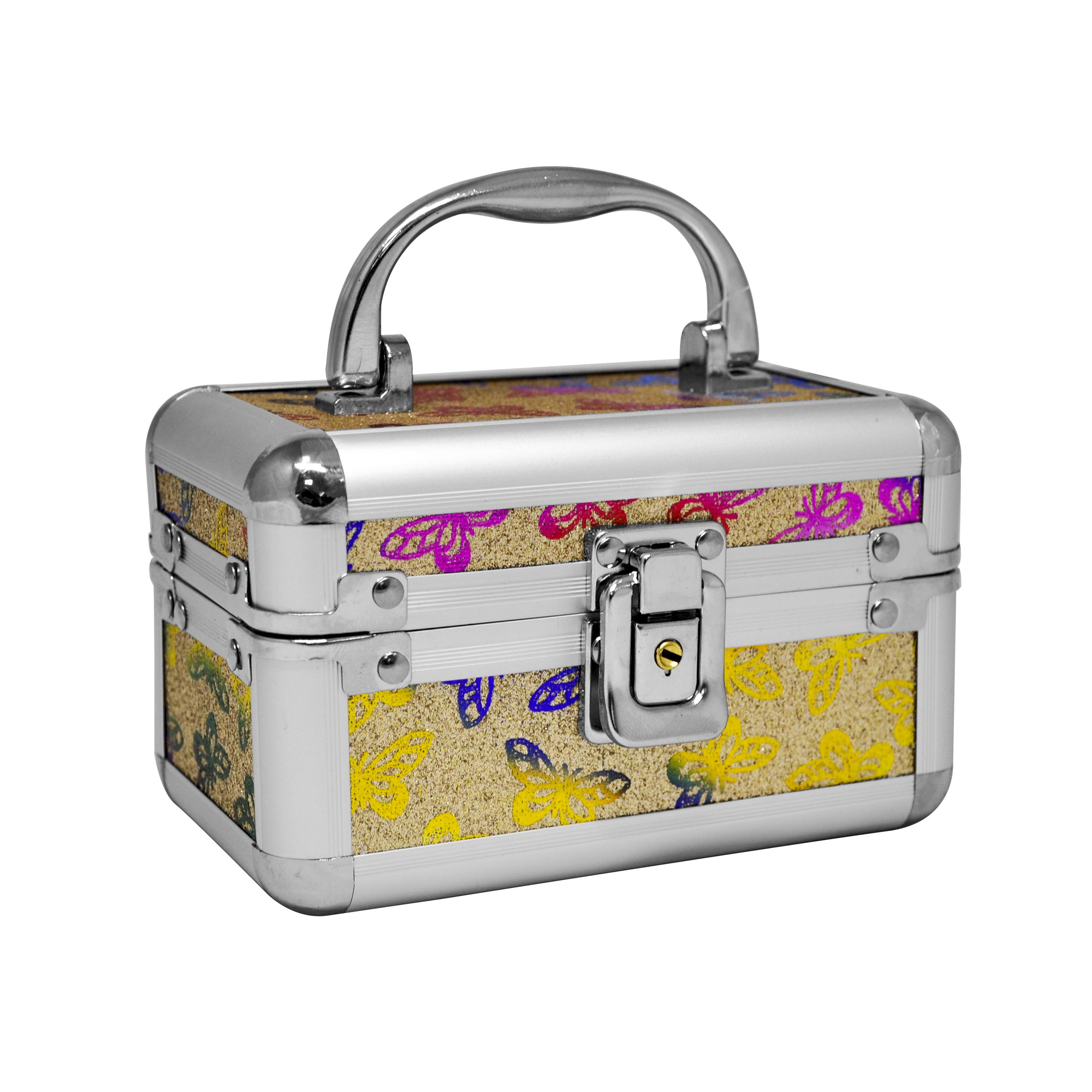 El Maletín con Bandeja PVC (15x9x9 cm) de Jessamy destaca por su diseño delicado con mariposas sobre fondo beige. Su interior forrado en terciopelo rojo incluye una bandeja extraíble y espejo incorporado, ideal para organizar maquillaje o accesorios. El cierre metálico y el asa superior brindan seguridad y portabilidad. Es perfecto para uso personal o como regalo funcional y elegante.