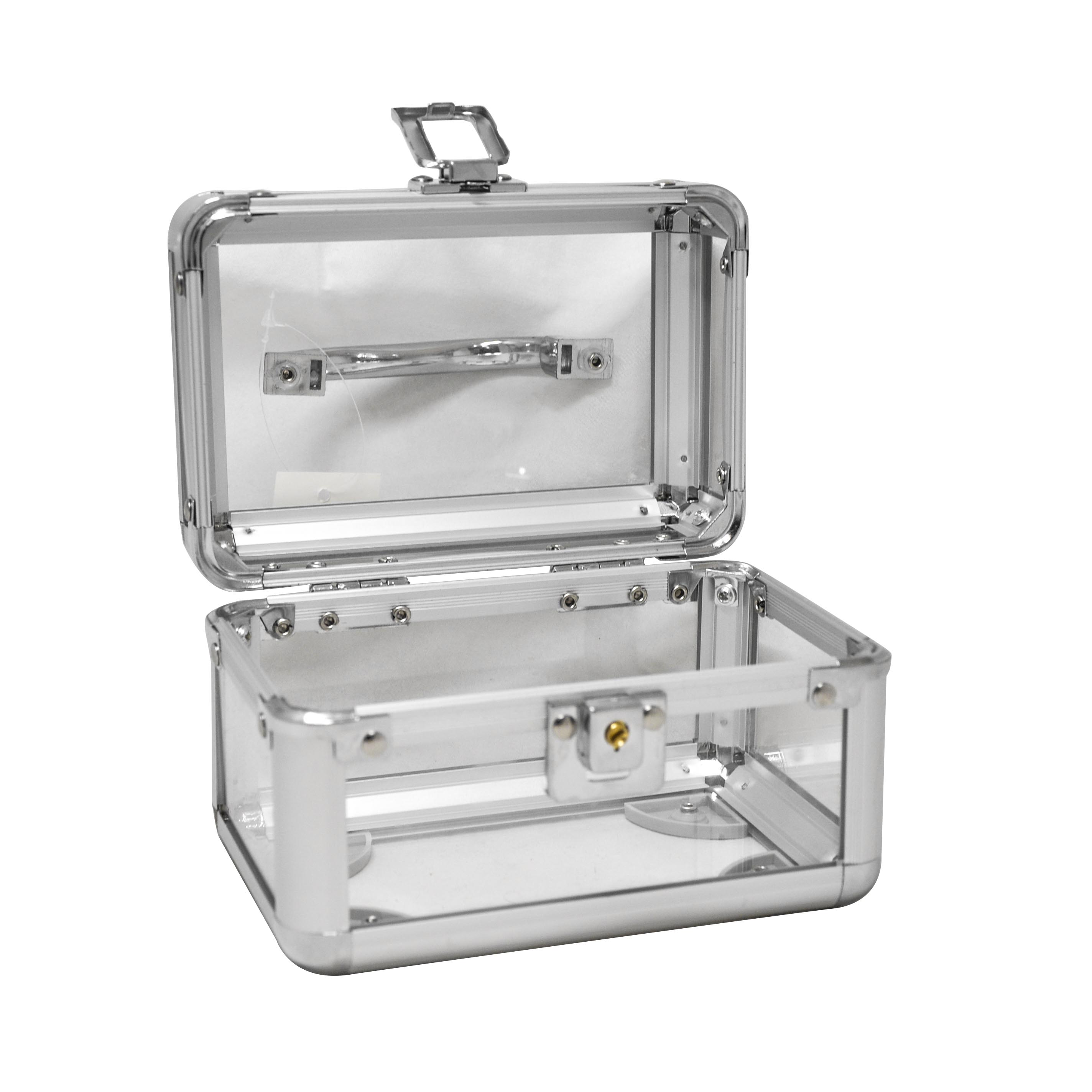 El Maletín Acrílico Jessamy (15x10x10 cm) ofrece una solución práctica y elegante para guardar objetos pequeños. Su estructura transparente permite visualizar el contenido fácilmente, mientras que los bordes metálicos y el cierre con llave brindan seguridad. El asa superior facilita el transporte, ideal para uso profesional o personal. Su diseño compacto lo convierte en un accesorio funcional y decorativo.