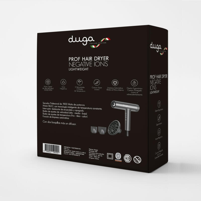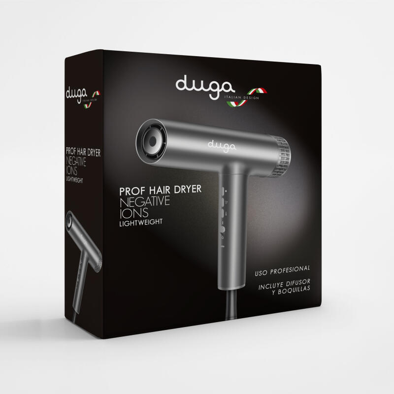 Secador Prof Hair Dryer con Iones Negativos y Ultra Liviano de la marca DUGA es una herramienta de calidad profesional que combina tecnología avanzada con comodidad y versatilidad, brindando resultados excepcionales para el cuidado del cabello.