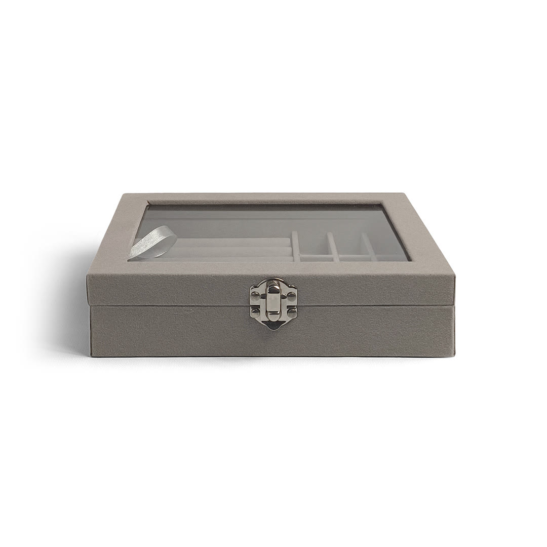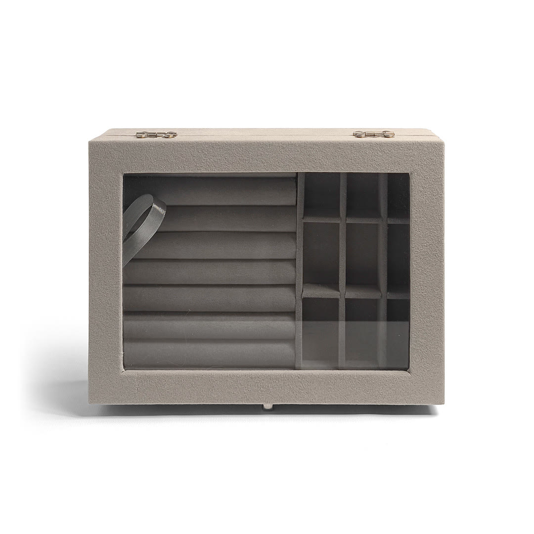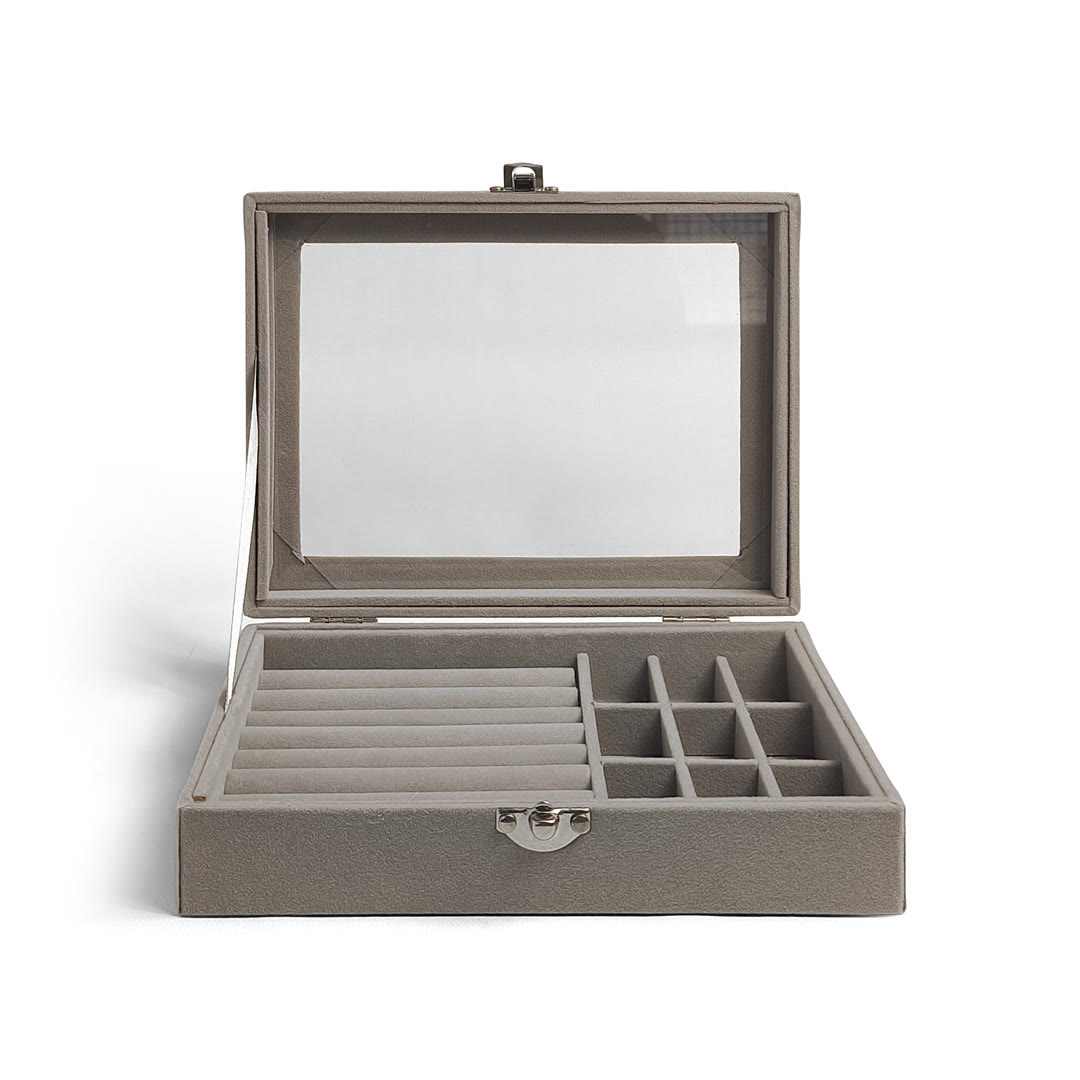 Este joyero Glam View de Jessamy combina estilo y funcionalidad en un diseño moderno con tapa transparente. Su interior aterciopelado incluye espacios individuales y un sector acolchado ideal para anillos o aros. La estructura rígida protege tus piezas favoritas mientras las mantiene siempre visibles. Perfecto para tener tus joyas ordenadas, seguras y al alcance de la mano.