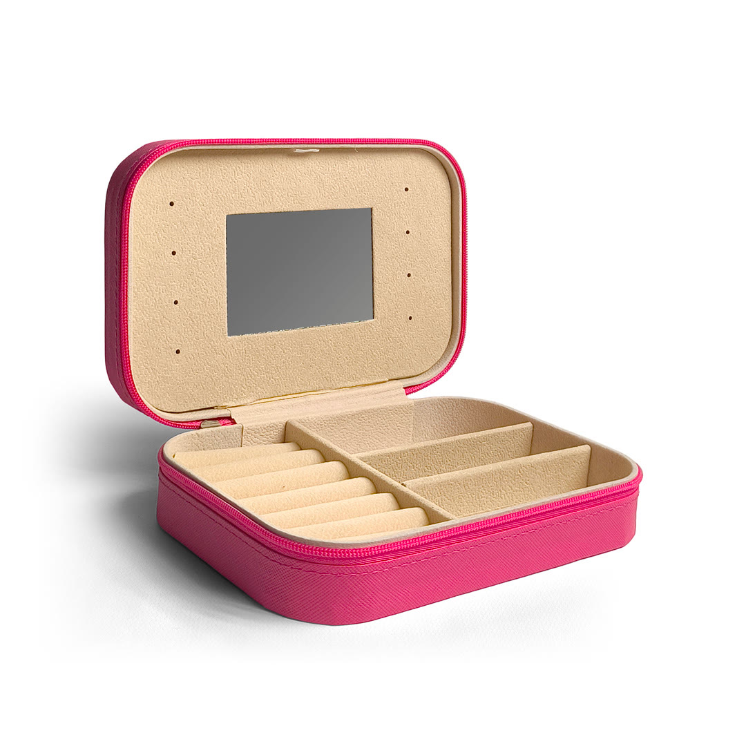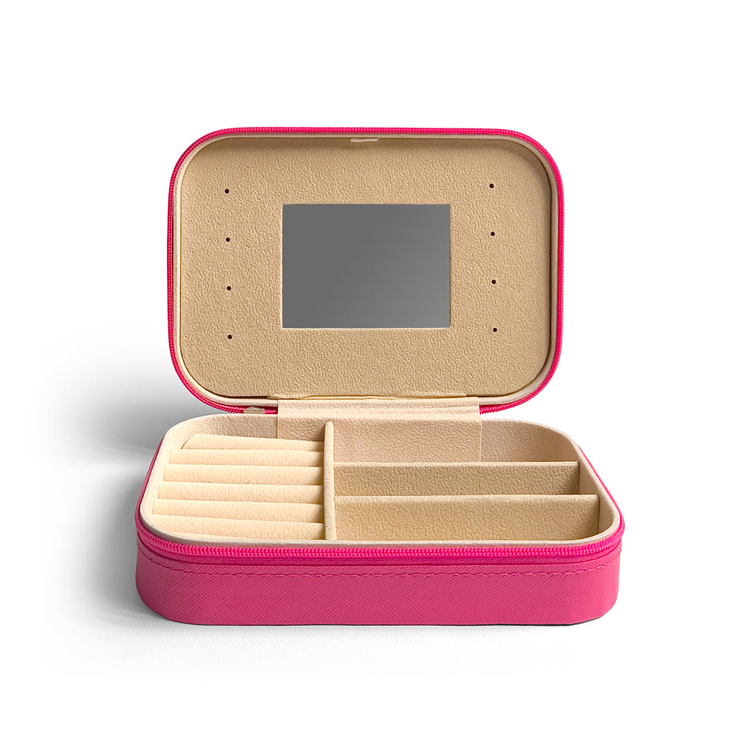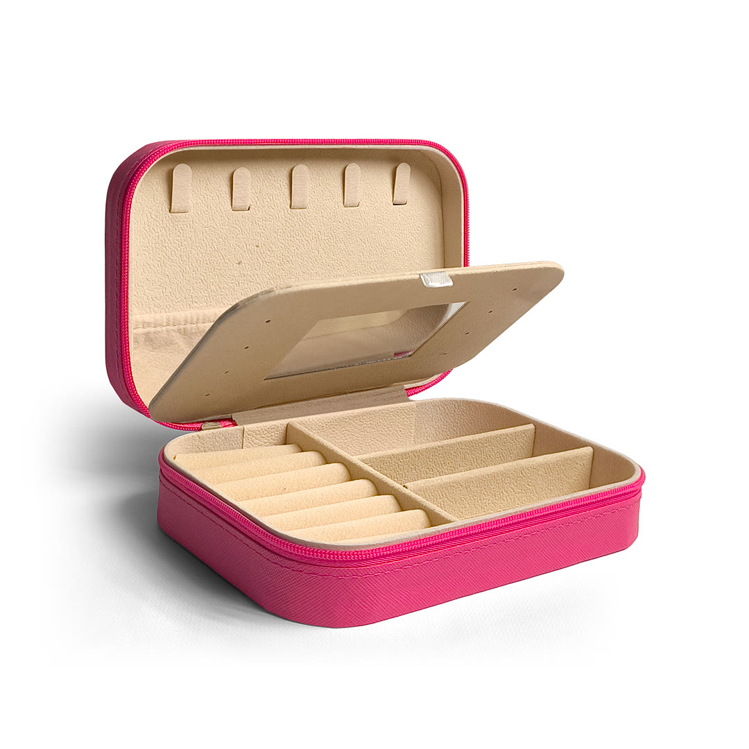 Su interior aterciopelado cuida tus accesorios evitando rayones, mientras que la tapa con espejo añade comodidad para el uso diario.