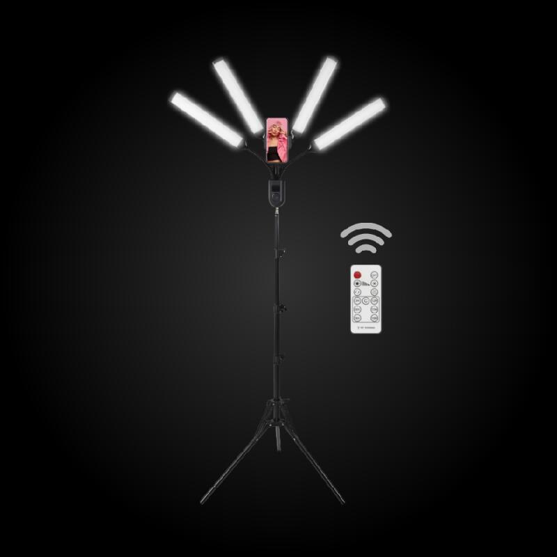 La lámpara LED de cuatro tubos con soporte para celular es perfecta para grabar videos con excelente iluminación. Ofrece una luz uniforme que elimina sombras y resalta detalles (Luz Calida - Fría - Neutra). Los tubos de luz LED son ajustables en ángulo, y el soporte para celular garantiza una posición óptima. El trípode ajustable ofrece una base estable y segura.