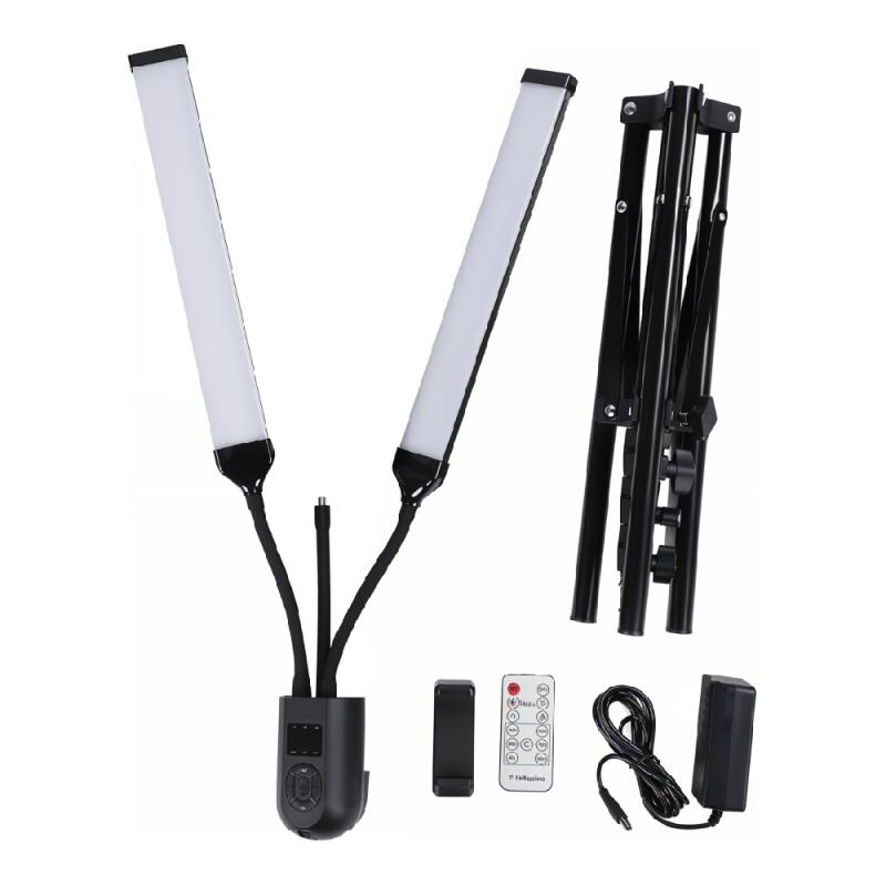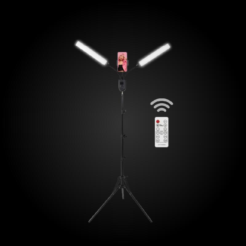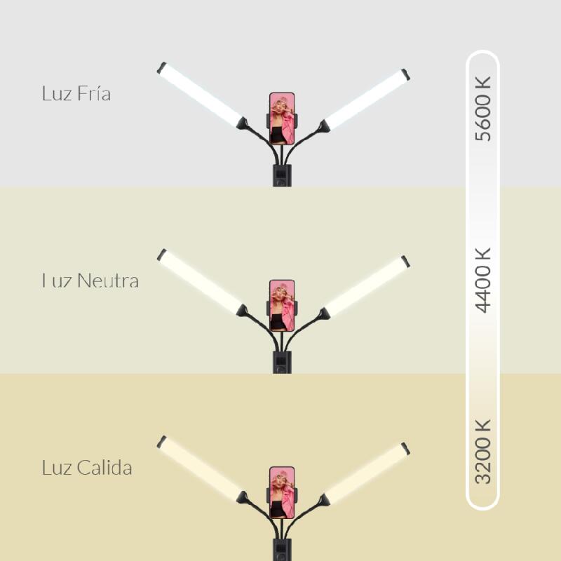 La lámpara LED de dos tubos con soporte para celular es perfecta para grabar videos con excelente iluminación. Ofrece una luz uniforme que elimina sombras y resalta detalles (Luz Calida - Fría - Neutra). Los tubos de luz LED son ajustables en ángulo, y el soporte para celular garantiza una posición óptima. El trípode ajustable ofrece una base estable y segura.